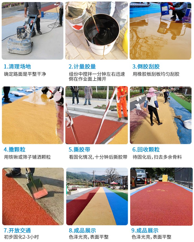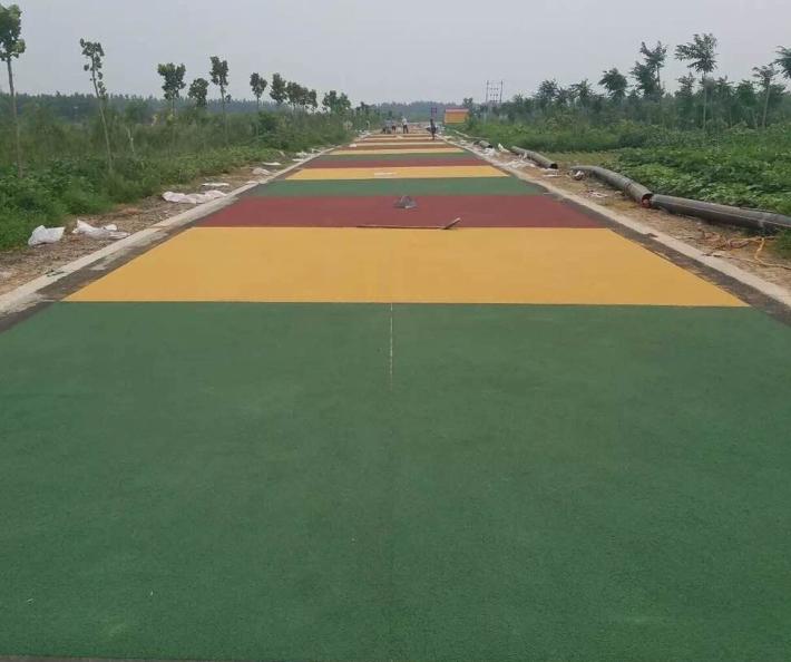 彩色防滑路面的優點:防滑性能高,路面散水性好,色彩鮮艷;施工快速容易,鋪設效率高。特別配制的粘合劑固化快:速固化保證了持續施工,重新開放公路所需的時間大大減少;減少工作場地面積:比其他解決方案可省一半費用;降低噪音:用骨料做成的精細結構有傳導音頻的效果,在水泥路面上使用可以將噪音降低;減少剎車距離:優良的防滑性能減少40%的剎車陸離,此外重型卡車在轉彎處剎車不會產生抱死現象;最小的厚度:設計厚度為3-5mm,無須調整街道設施,也不影響排水;色彩鮮艷、可根據客戶要求提供顏色;用于交通減速帶時有很好的視覺和聽覺效果。